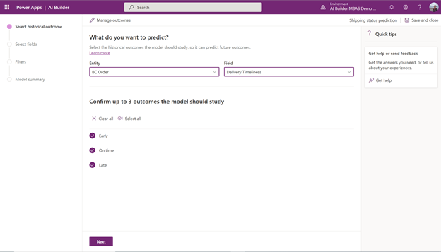 이러한 새로운 기능은 예측 모델을 더 풍부하게 만들고 더 많은 비즈니스 문제를 해결할 수 있습니다. - 이전에는 AI Builder 예측 모델이 배송이 정시에 도착하는지 여부와 같은 이진 결과를 예측할 수 있었습니다.