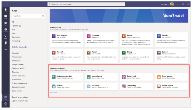 - 광범위한 배포 앱을 사용하면 Teams 팀 내에서 빌드된 앱을 회사 내부의 다른 사람들과 공유할 수 있습니다.