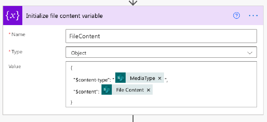 파일 내용은 선택한 파일의 파일 내용에서 가져옵니다. 이전 흐름에서는 파일 콘텐츠가 FileContent 변수에 저장되었습니다 . 이런 식으로 할 필요는 없지만 이 템플릿이 설정되는 방식입니다.