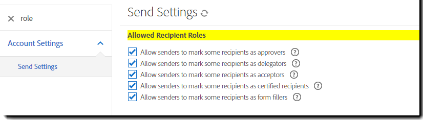 역할 옵션을 활성화/비활성화하려면 계정 관리자로 로그인하고 계정 > 계정 설정 > 전송 설정 > 허용된 수신자 역할로 이동합니다.