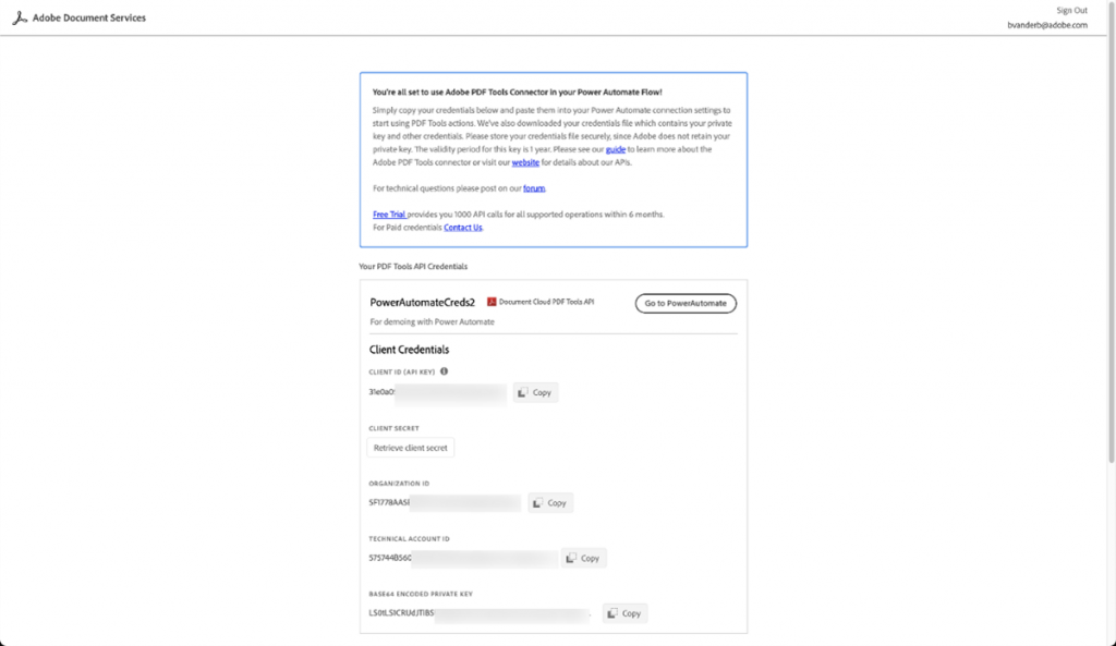 - Adobe PDF 도구에 대한 새 연결을 만듭니다. 당신은해야합니다 클라이언트 ID , 클라이언트 비밀 , 조직 ID , 기술 계정 ID 및 개인 키 는 설정 키를에서합니다.
