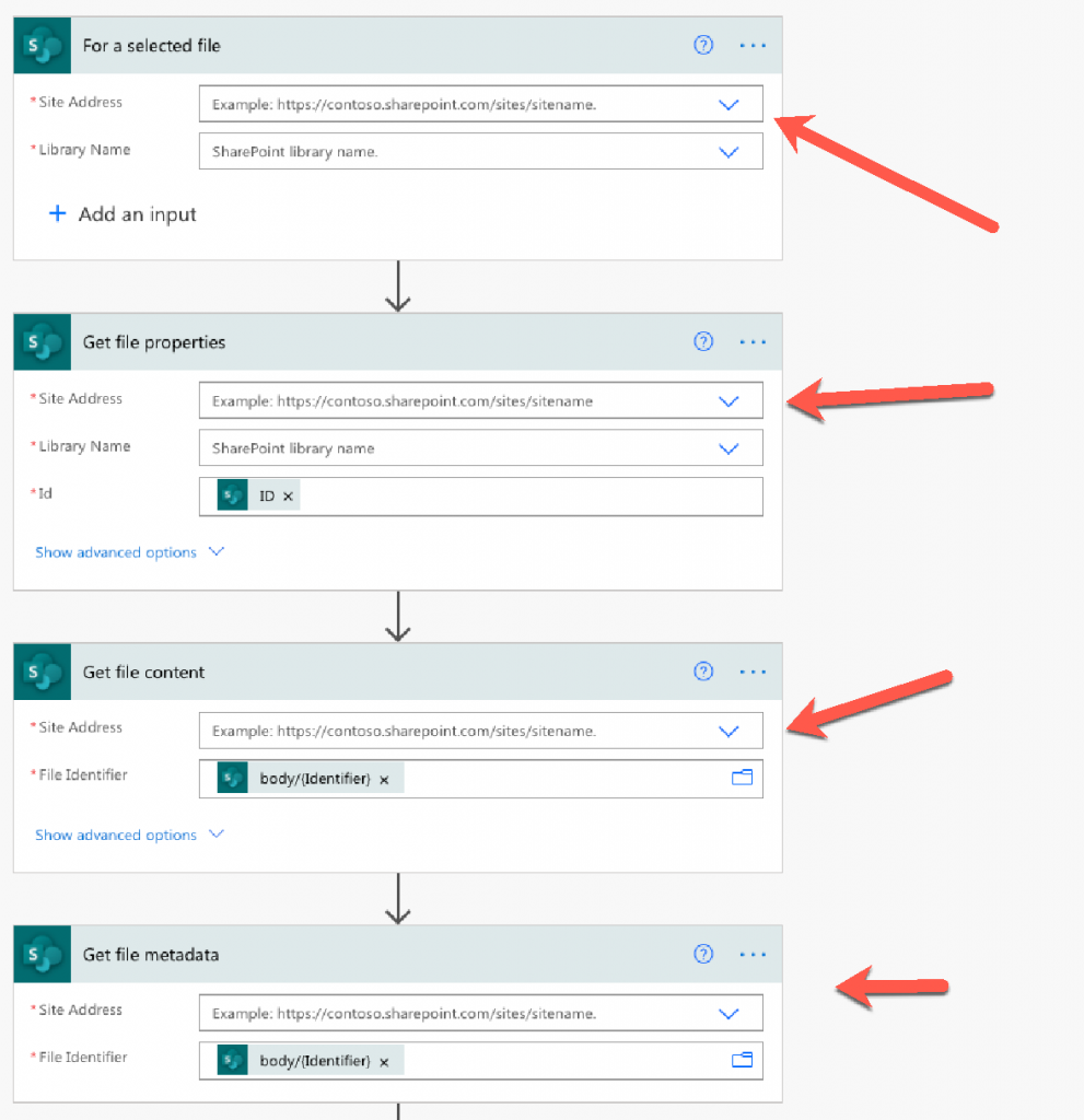 예를 들어 선택한 파일의 경우 , 가져 오기 파일 속성 , 파일 내용 가져 오기 및 파일 메타 데이터 가져 오기 작업을 설정된 사이트 주소 및 라이브러리 이름 원하는 SharePoint 사이트를 설정합니다.