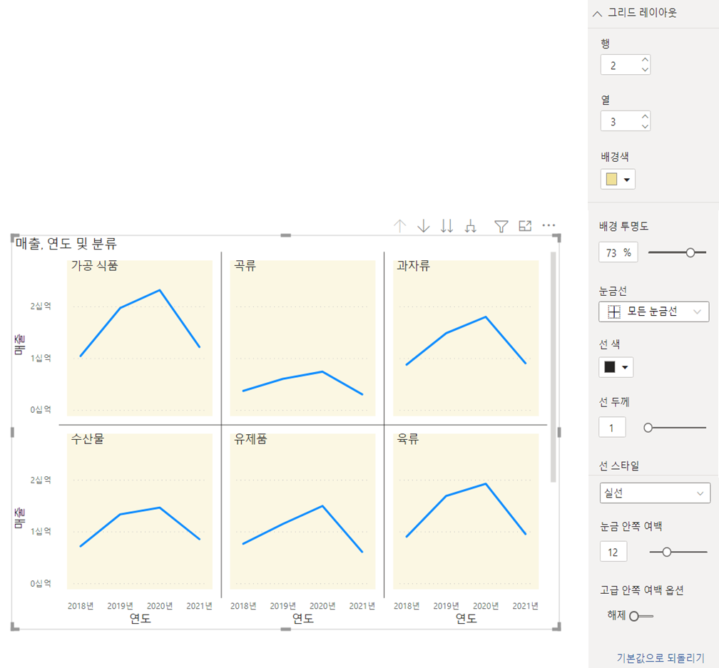 Small Multiples 미리보기 기능에 대한 작업을 계속하면서 그리드 레이아웃 서식 카드에 그리드 라인 및 배경색 컨트롤을 추가