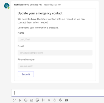 2. 그런 다음 HR, IT에서 법무 부서에 이르기까지 조직 내에서 끝없는 사용 사례를 잠금 해제하는 응답과 함께 메시지, 적응형 카드 또는 적응형 카드로 게시할 수 있습니다.