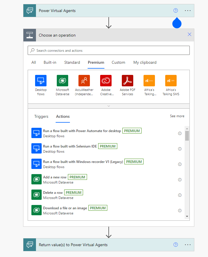 Power Automate 흐름을 호출하여 Power Virtual Agents에서 작업을 수행할 수 있습니다 . 흐름은 고객 주문 상태 검색 또는 약속 예약과 같은 활동을 자동화하거나 백엔드 시스템을 호출하는 데 도움이 될 수 있습니다.