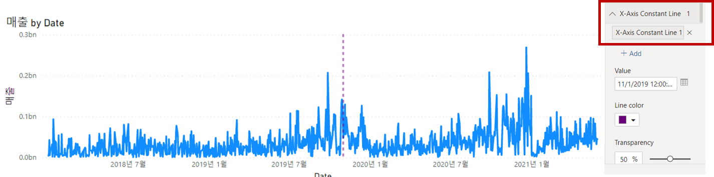 - 기존 Y 축 상수 선과 마찬가지로 색상, 투명도 백분율, 선 스타일, 위치, 데이터 레이블에서 선에 대한 모든 종류의 옵션을 구성 가능