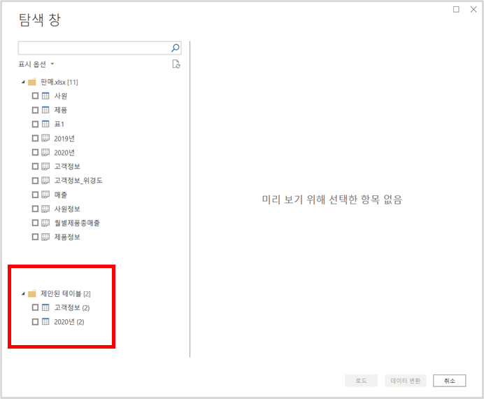 사용자가 해당 테이블 구성을 완료하면 로드 / 변환을 클릭하여 데이터 가져 오기 흐름을 완료 가능