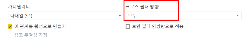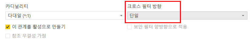 크로스 필터 방향 옵션–단일 : 관계가 설정된 두 테이블의 필터가 1에서 다(*) 방향으로 적용되는 것을 의미