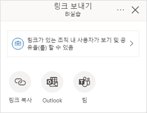공유 링크를 복사하거나 Outlook 및 Teams를 통해 조직의 사람들과 공유 할 수있는 이 새로운 링크 보내기 대화 상자가 표시