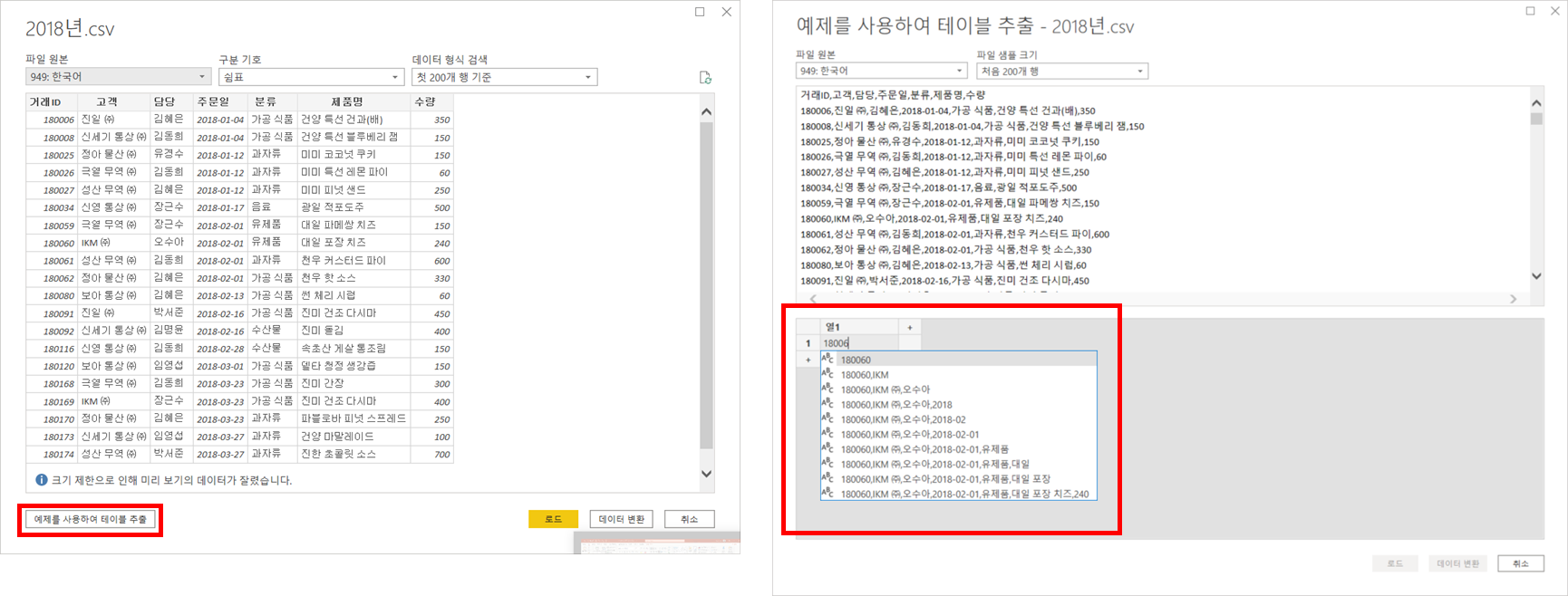 텍스트 / CSV 커넥터를 사용할 때 사용자는 파일 미리보기 대화 상자의 왼쪽 하단에 "예제를 사용하여 표 추출"에 대한 새로운 옵션 확인 가능