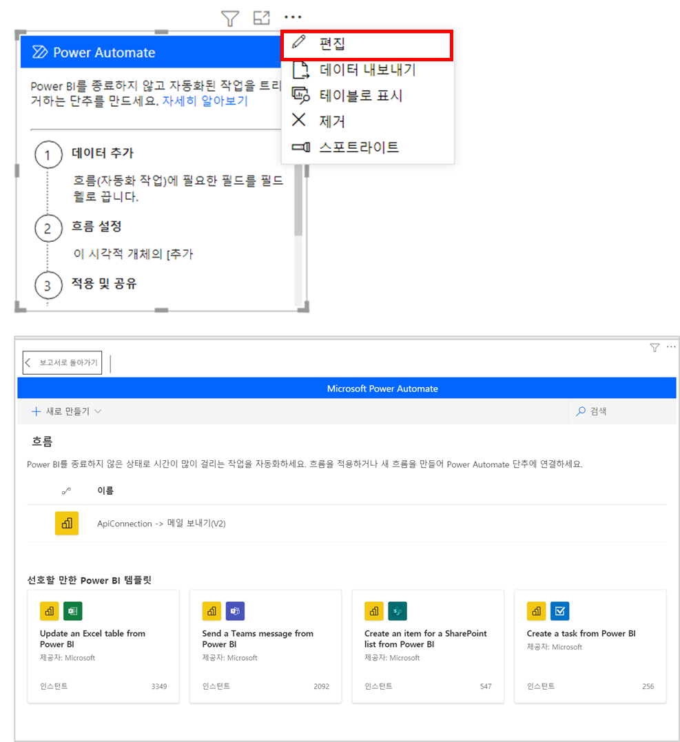 PowerAutomate 시각화 삽입 → 필드 드래그 →시각화 '...' 클릭 → 편집 클릭