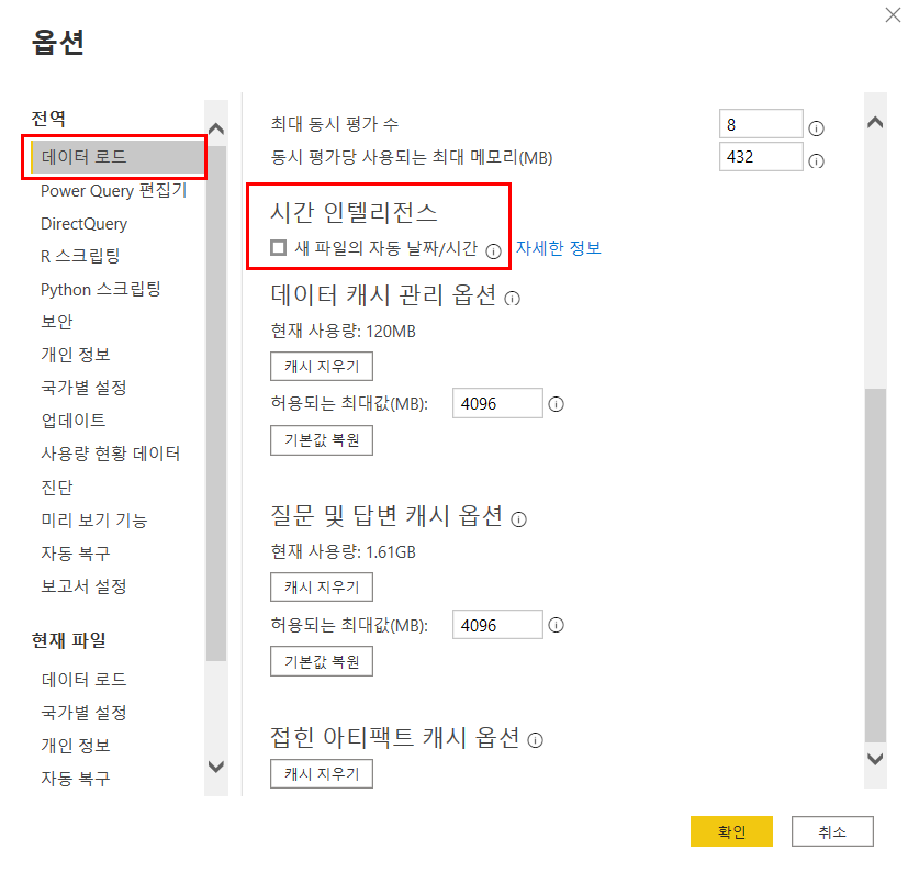 날짜 필드 사용시 자동으로 계층이 형성됩니다. 백그라운드에서 자동으로 생성되는 날짜 테이블을 제거하기 위해 아래와 같이 PowerBI Desktop에서 [데이터 로드] - [시간인텔리전스] - [새 파일의 자동 날짜/시간]을 해제합니다.