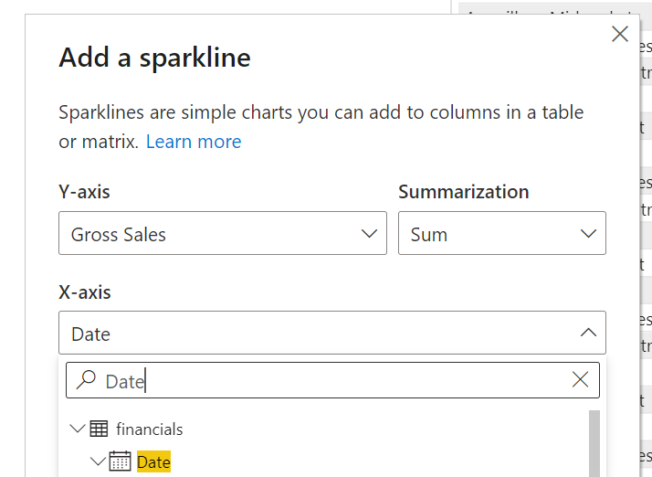 또한 스파크라인의 x축으로 사용할 필드(예: 날짜 열)를 선택해야 합니다.