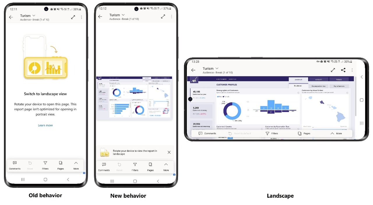 이 Power BI Mobile 업데이트에서는 해당 제약 조건을 제거했습니다. 이제 원하는 방향으로 보고서 페이지(모바일 최적화 여부)를 볼 수 있습니다. 보고 있는 보고서 페이지에 모바일에 최적화된 레이아웃이 없지만 휴대전화를 세로 방향으로 유지하려는 경우 보고서의 가로 보기가 더 작게 표시됩니다.