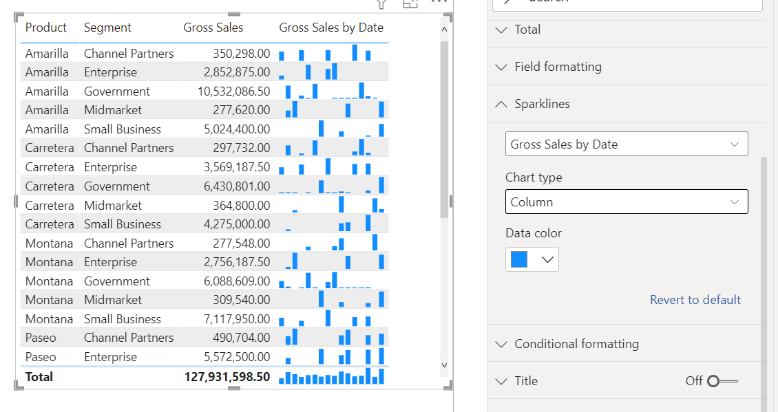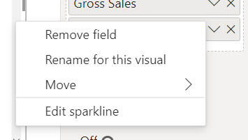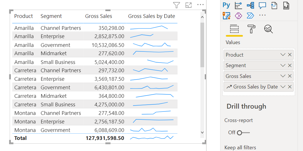 미리보기 기능이 활성화되면 필드 웰을 통해 테이블과 매트릭스 비주얼 모두에 스파크라인을 추가할 수 있습니다.