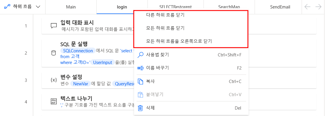 - Main 또는 다른 하위 흐름 내에서 작업을 추가/삭제/편집/이동합니다.