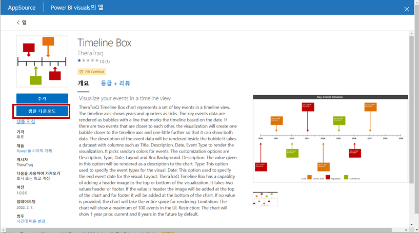 •이제 제품 내 AppSource의 시각적 페이지에서 "샘플 다운로드"를 클릭하고 시각적 게시자가 만든 샘플 Power BI 보고서를 다운로드할 수 있습니다.