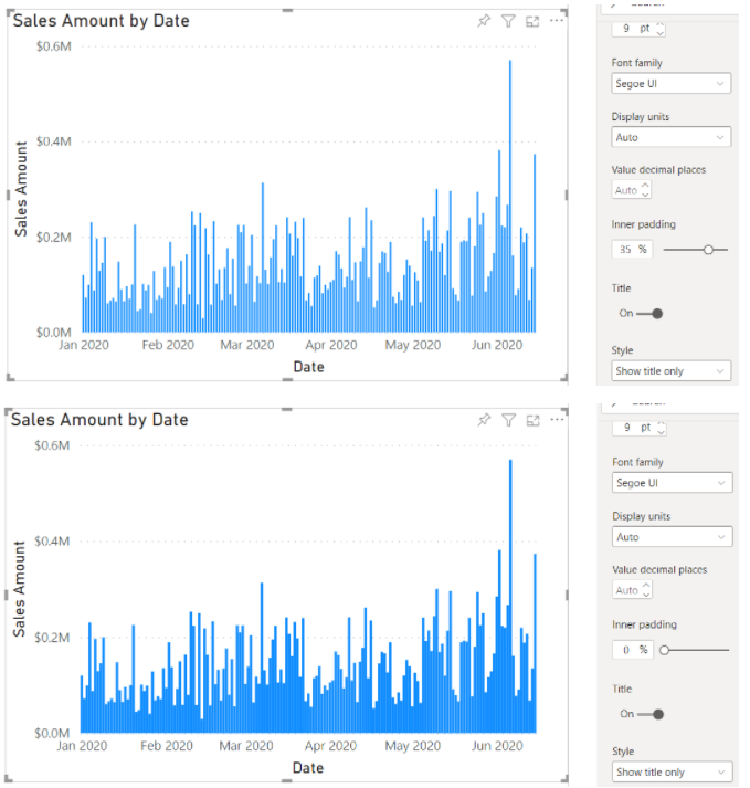 - 범주형 축이 있는 데카르트 차트의 서식 창에는 범주 막대, 열 및 클러스터 사이의 패딩 크기를 조정하는 "내부 패딩" 옵션이 있습니다. 이것은 열과 막대의 두께와 그 사이의 공백 크기를 결정하는 데 도움이 됩니다. 이번 달에는 이 옵션을 연속 축에도 추가하여 차트의 모양과 느낌을 더 잘 제어할 수 있습니다.