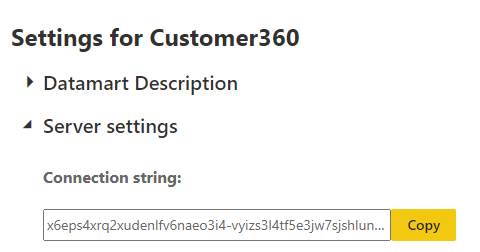데이터마트 위에 데이터 세트를 만들려면 Azure SQL 데이터베이스 커넥터를 사용하고 서버 이름에 Datamart의 SQL 연결 문자열을 지정할 수 있습니다. 데이터마트를 만든 경우 데이터마트 설정(작업 영역의 데이터마트에서 상황에 맞는 메뉴 작업)에서 SQL 연결 문자열을 가져올 수 있습니다.