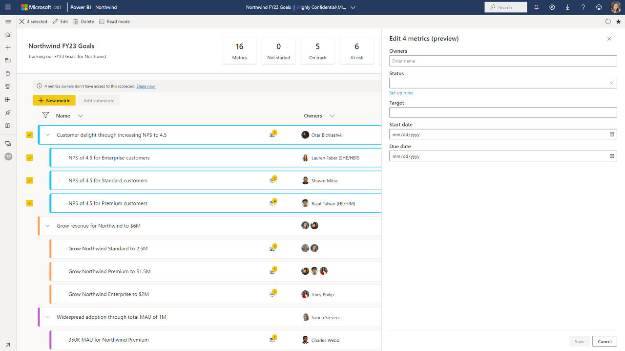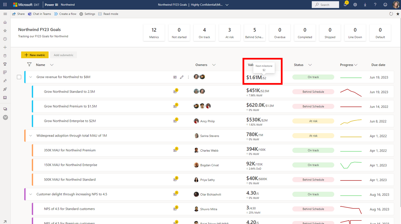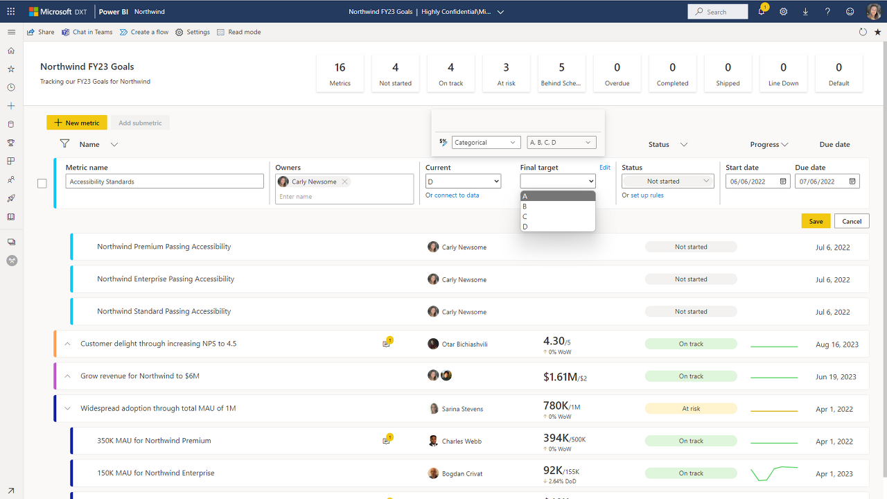 Power BI 메트릭(이전에는 '목표'로 알려진 기능)에 대해 발표할 여러 가지 흥미로운 업데이트가 있습니다. 이번 달에는 지정된 메트릭 내에 날짜 관련 이정표를 추가할 수 있는 여러 이정표, 숫자가 아닌 항목을 추적하는 데 도움이 되는 범주형 메트릭 및 대량 업데이트 기능의 보강이 추가되었습니다. 또한 Power BI 메트릭이 이제 고객 관리 키를 지원함을 발표하게 되어 기쁩니다.