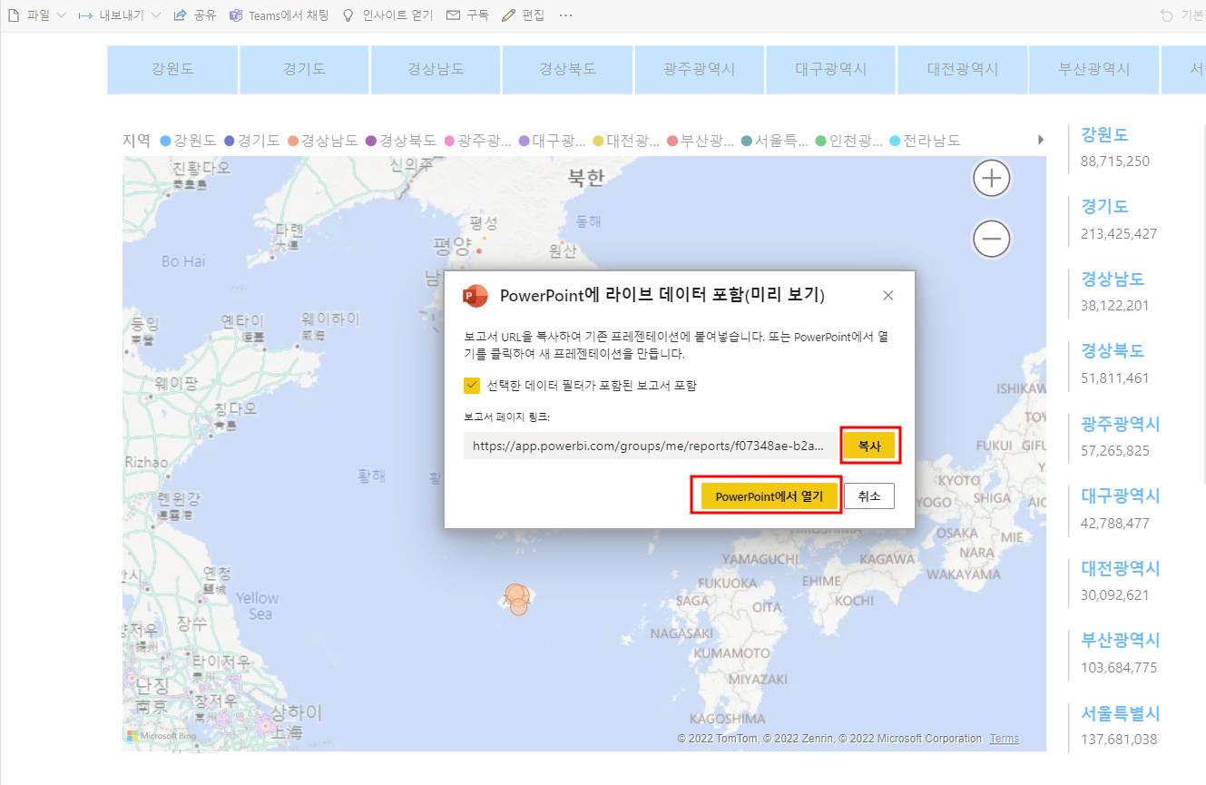 옵션 1: 링크를 복사하여 기존 프레젠테이션에 추가한 Power BI 추가 기능에 붙여 넣습니다.