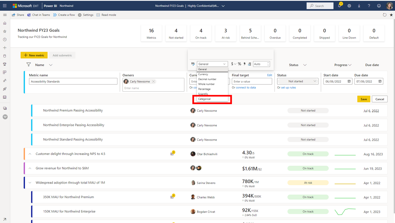 숫자가 아닌 메트릭을 추적하기 시작합니다. 범주형 메트릭을 통해 스코어카드는 접근성, NPS 범주 점수(비추천자, promotor 등) 등과 같은 시나리오를 지원합니다. 시작하려면 현재 및 대상 값을 선택할 때 부동 서식 표시줄에서 범주를 선택합니다.