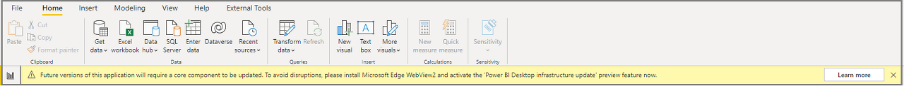 인프라 업데이트의 일환으로 WebView2로 전환하는 동안 인내심을 가져 주셔서 감사합니다. GA에 가까워지면서 가능한 한 많은 문제를 해결했는지 확인하고 싶습니다. 이 릴리스부터 WebView2가 아직 설치되어 있지 않은 경우 Power BI Desktop을 시작할 때마다 다음 경고가 표시됩니다.