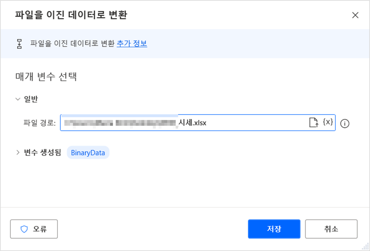 파일콘텐츠는 앞에서 이진데이터로 변환한 값이 저장된 '%Binary Data%' 변수를 가져와서 표시 합니다.