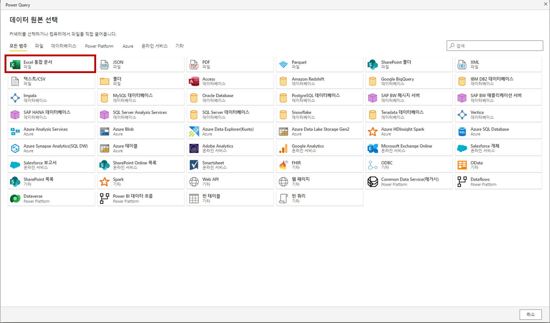 작업영억 만들기(라이선스는 Premium) 2. 작성한 작업 영역의 '새 데이터 마트' 클릭 3. '데이터 가져오기'를 클릭합니다. 4. 가져올 데이터 원본을 선택합니다. 'Excel통합문서'를 선택합니다. 5.연결할 파일을 선택합니다. 6. 가져올 테이블을 선택하고,하단의 '데이터 변환'을 클릭합니다. 7. 테이블이름과 필드이름을 영문으로 변경하고, 데이터의 형식과 머리글행 등을 확인하고 '저장'을 클릭합니다. (테이블 이름과 필드이름이 한글로 되어 있으면 오류가 납니다.) 8.데이터가 로드되어 아래와 같이 표시됩니다. 9. 하단의 'Model' 아이콘을 클릭하고 관계를 설정합니다. 10. 메뉴의 '새 측정값'을 사용하여 필요한 측정값을 작성할 수 있습니다. 11. 왼쪽 메뉴의 작업영역을 클릭하면 데이..