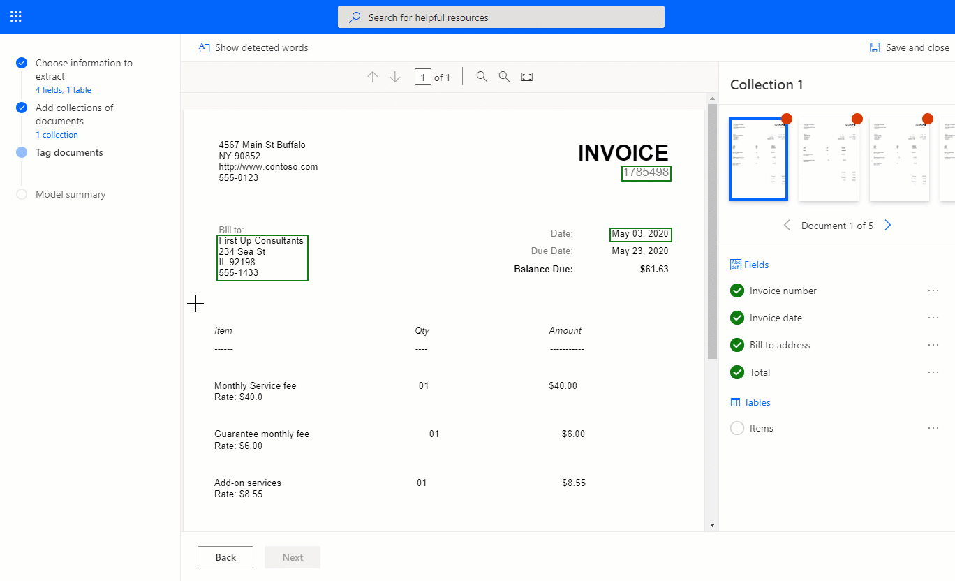 양식 처리 모델이 학습되고 게시되면 Microsoft Power Automate의 자동화 흐름이나 Microsoft Power Apps의 앱에서 모델을 사용할 수 있습니다. 최근 출시된 종단 간 문서 자동화 솔루션에서도 이를 활용할 수 있습니다.
