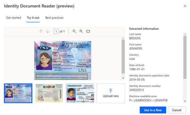 AI Builder를 사용하면 여권이나 운전 면허증을 거주 증명으로 사용하거나 호텔 체크인 목적으로 사용하는 경우 비즈니스 프로세스에서 이 데이터를 쉽게 읽고 내보낼 수 있습니다.