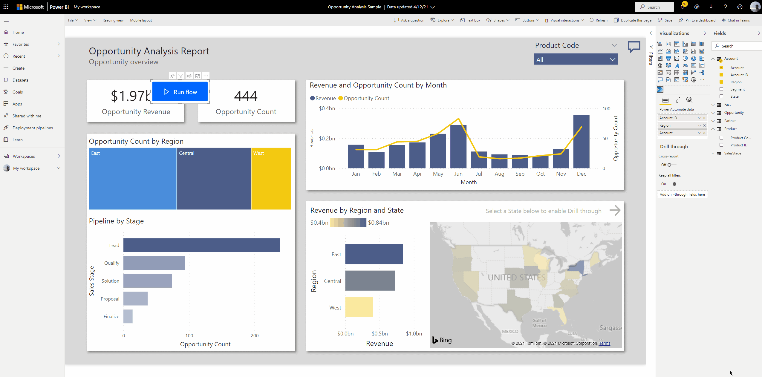 흐름을 추가한 후에는 보고서를 보는 동안 언제든지 이를 트리거할 수 있습니다. 흐름을 트리거할 때 Power BI는 보고서에 설정된 활성 필터를 기반으로 데이터를 전달합니다. 따라서 흐름을 트리거하기 전에 보고서에서 올바른 필터 매개변수를 설정했는지 확인하십시오.