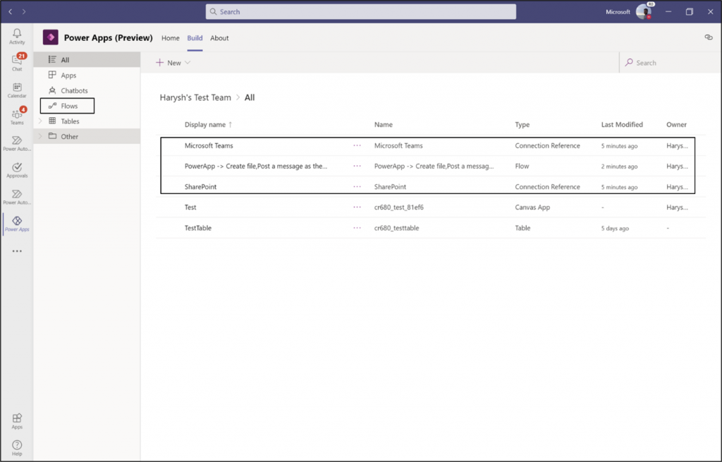 Power Automate가 Dataverse for Teams에 통합되어 사용자는 Dataverse for Teams로 빌드된 앱에 자동화를 쉽게 추가할 수 있습니다. 그림 2 는 Teams UI의 '솔루션 탐색기' 보기와 한 팀에 대해 Dataverse for Teams를 사용하여 만든 흐름 목록을 보여줍니다. Dataverse for Teams를 사용하면 앱, 봇 및 흐름이 지정된 팀의 팀원이 생성합니다. 팀이 앱, 봇 및 흐름을 소유하는 동안 원하는 경우 조직 전체에서 공유할 수 있습니다.