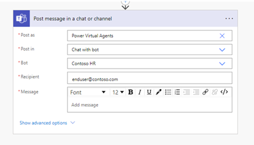 1. Power Automate 흐름을 만들고 "채팅 또는 채널에 메시지 게시"를 선택한 다음 Power Virtual Agents 봇을 선택해야 합니다.
