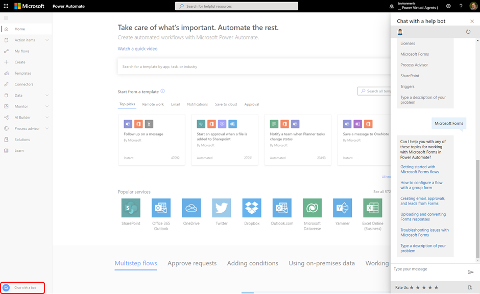 각 Power Automate 웹 페이지(예: Flow, Process Insights, AI Builder)의 왼쪽 하단에서 봇을 테스트할 수 있습니다.